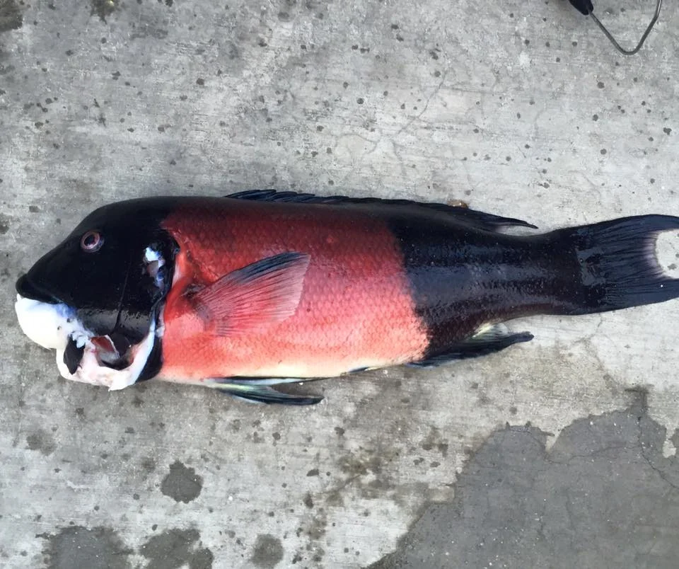 California Sheeps Head Fish. Eats sea urchins and Mollusks. Theses men just caught this specimen and say it's excellent eating. Apparently must me eaten the day it's caught so commercially unavailable to those that don't fish or dive. Live in our planet not on it.